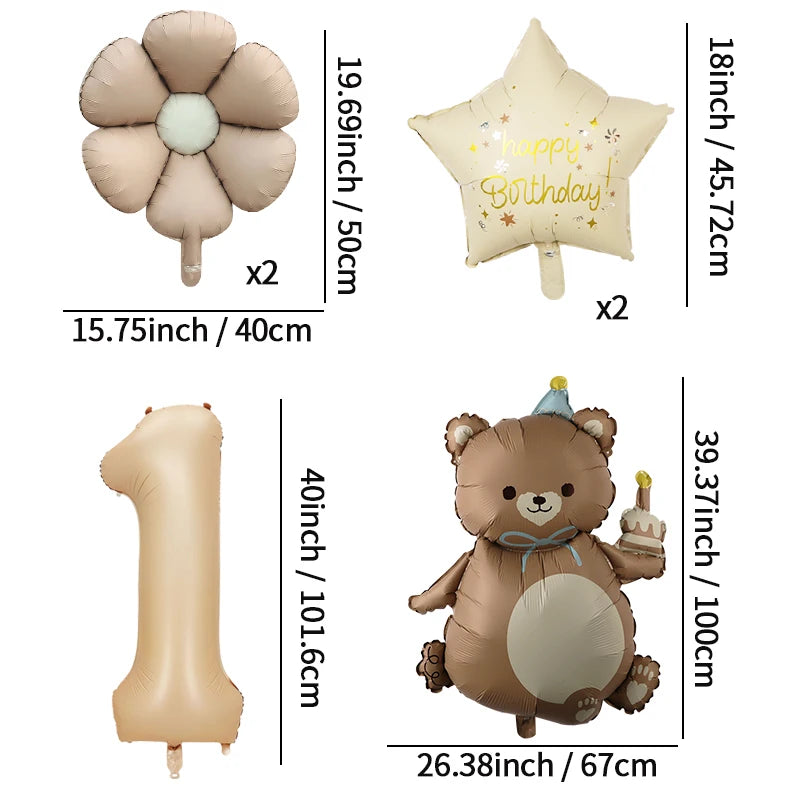 Inhalt: 1 cremefarbener Zahlenballon ~100 cm / 2 Gänseblümchenballons ~50 cm / 2 Sternballons mit Aufschrift „Happy Birthday“ ~45 cm / 1 Teddybärballon ~100 cm