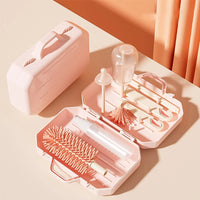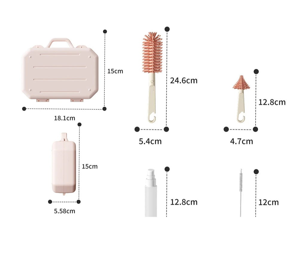 1x Brosse longue pour biberons, 1x Brosse pour tétines, 1x Mini-brosse pour coins étroits, 1x Mini bouteille pour produit nettoyant, 2x Supports de rangement pour égoutter le biberon et la tétine, 1x Boîte de transport compacte
