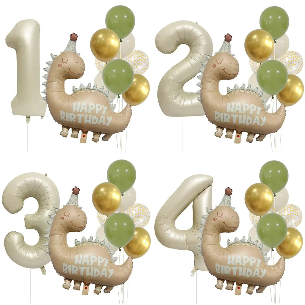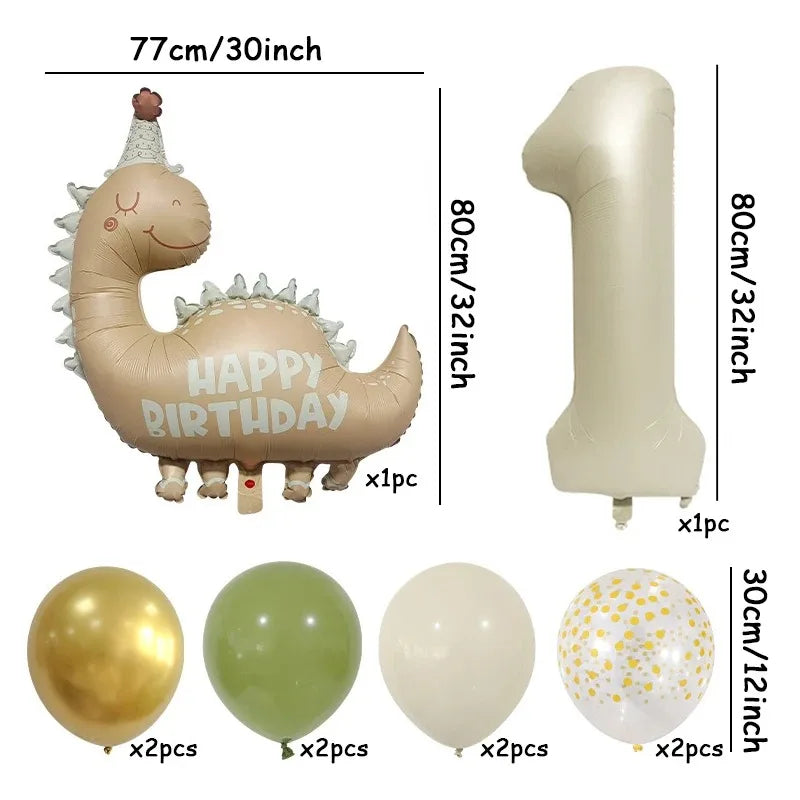 * 1 ballon dinosaure 77cm x 80cm (aluminium caramel mat) + 1 chiffre géant (à choisir de 0 à 9 – 80 cm) + 8 ballons de 30cm doré, vert sauge, confetti et crème
