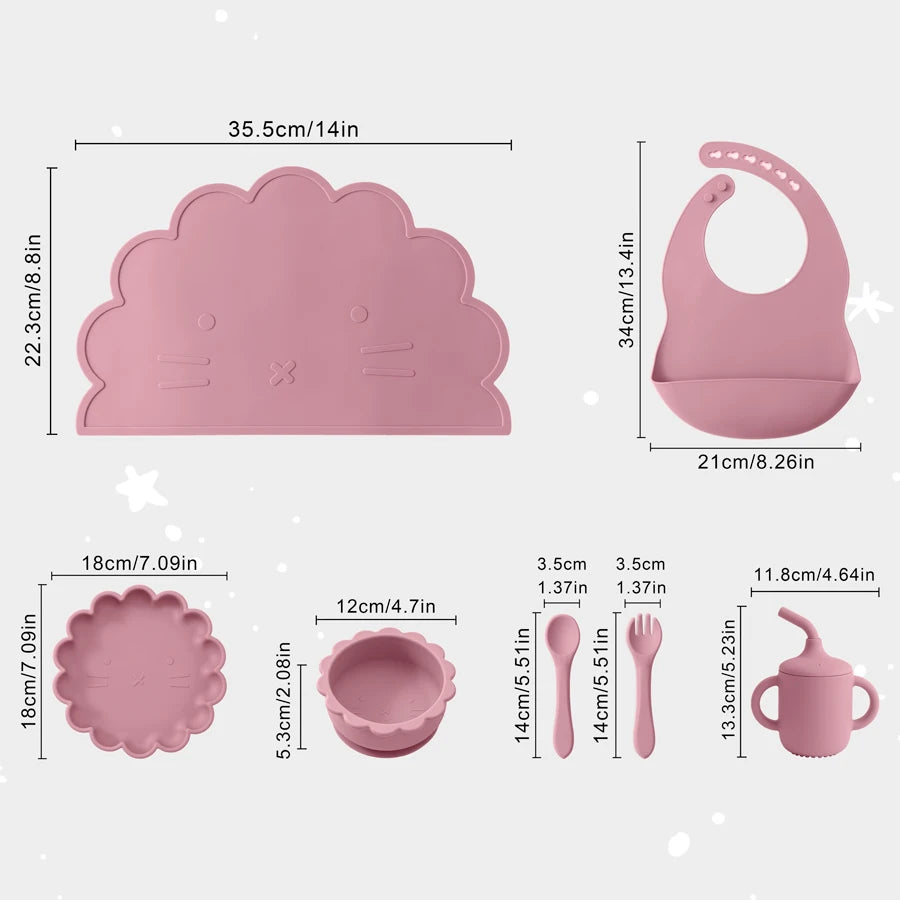 Make mealtimes easier for your baby with this fun, complete 7-piece Kidslands® set. Made from BPA-free food-grade silicone , each piece in the set is designed to promote independence and safety when learning to eat. Its cute, scalloped, serrated design will delight young and old alike!