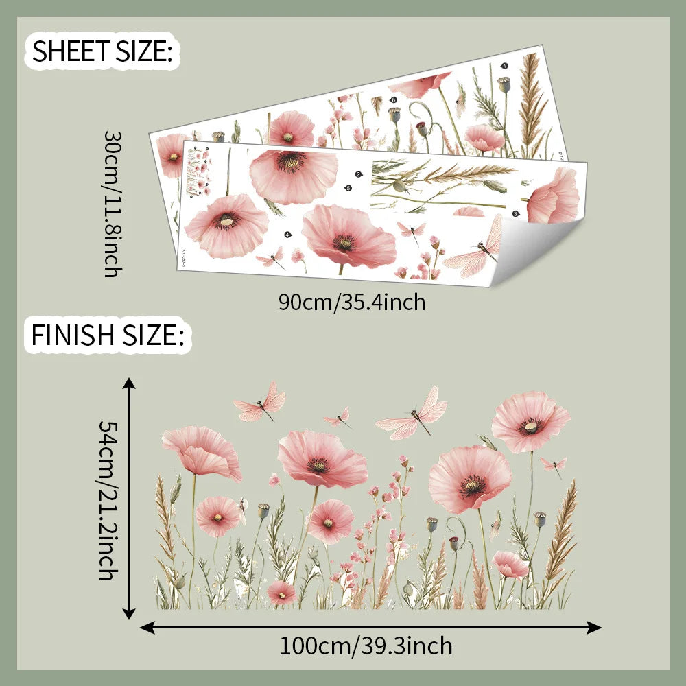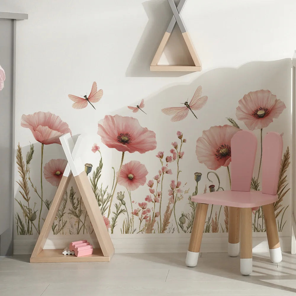 Kidslands® | Stickers Muraux Fleurs Aquarelle Coquelicot & Libellules –Déco Murale Panoramique Romantique Rose